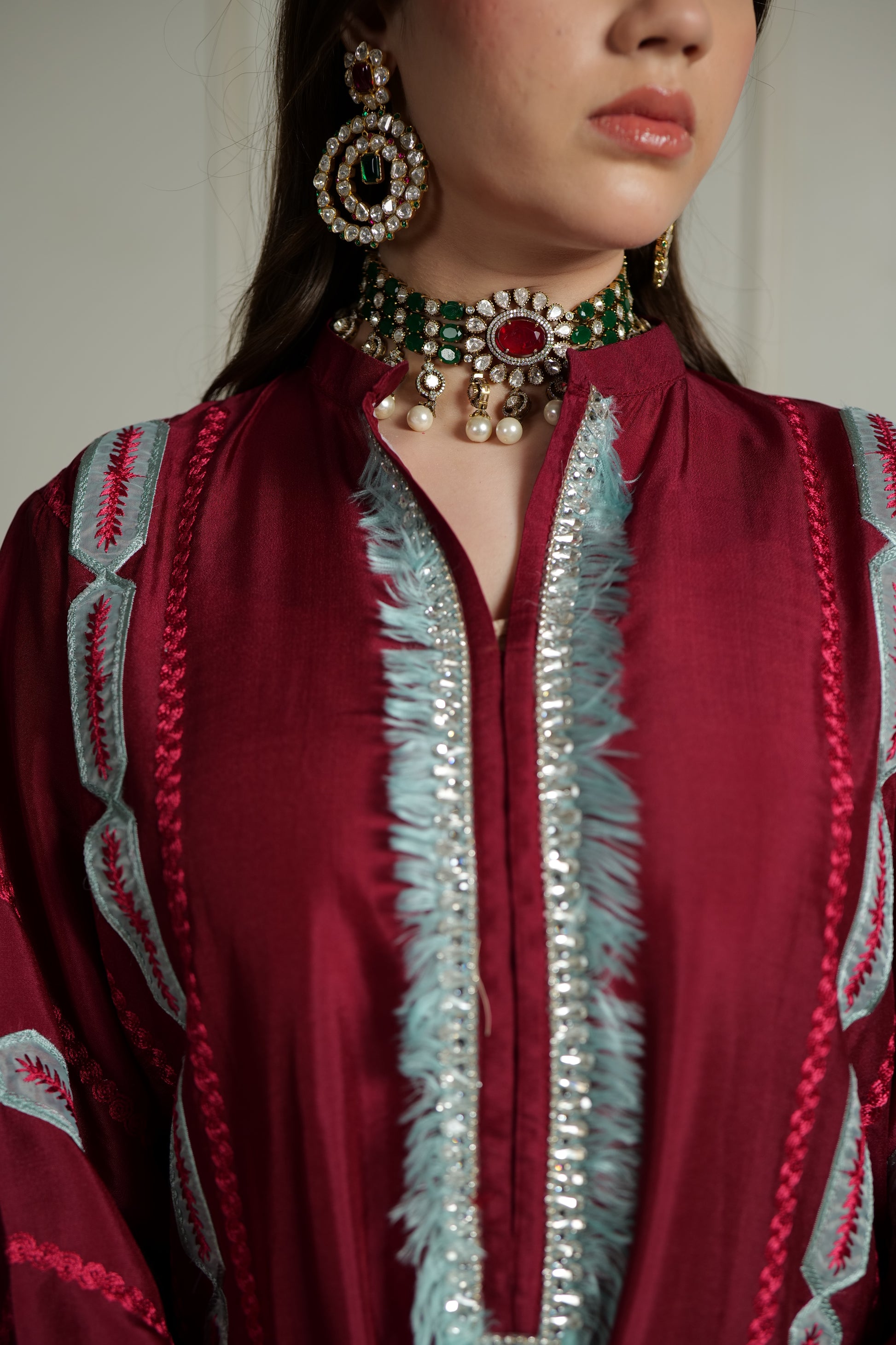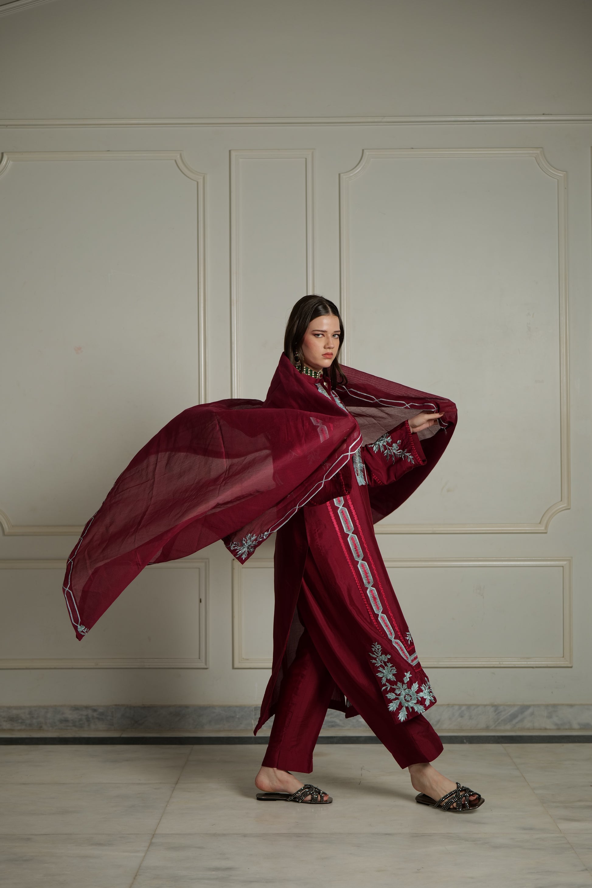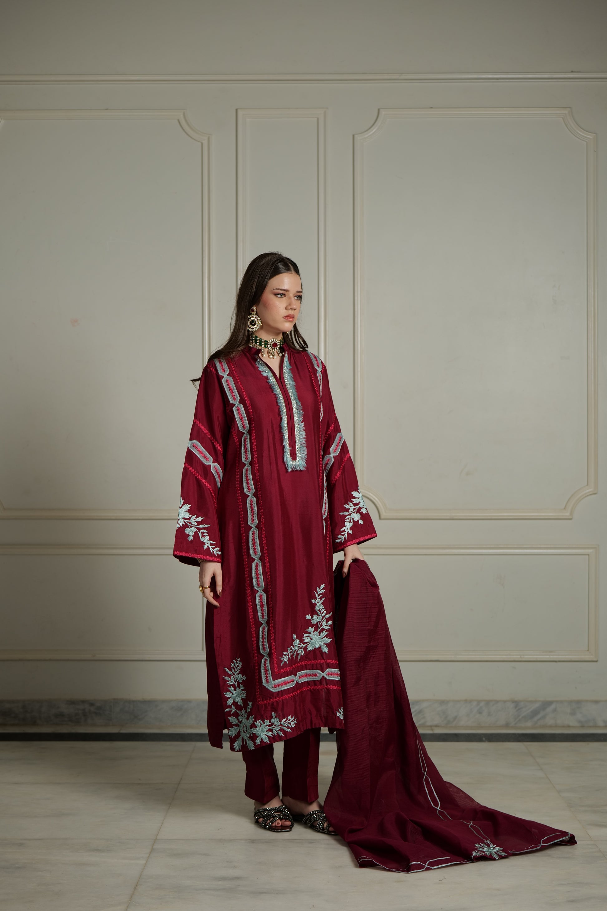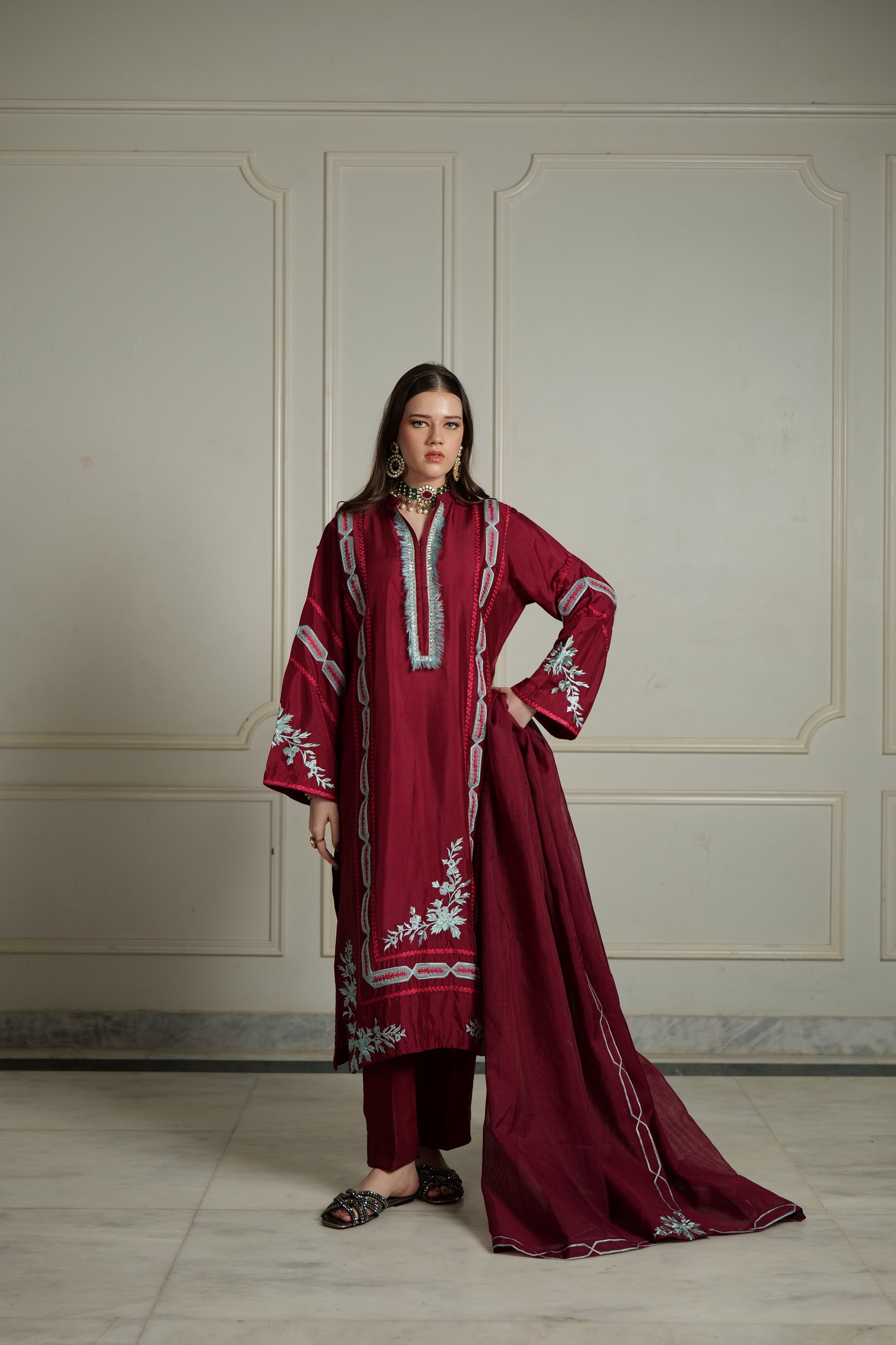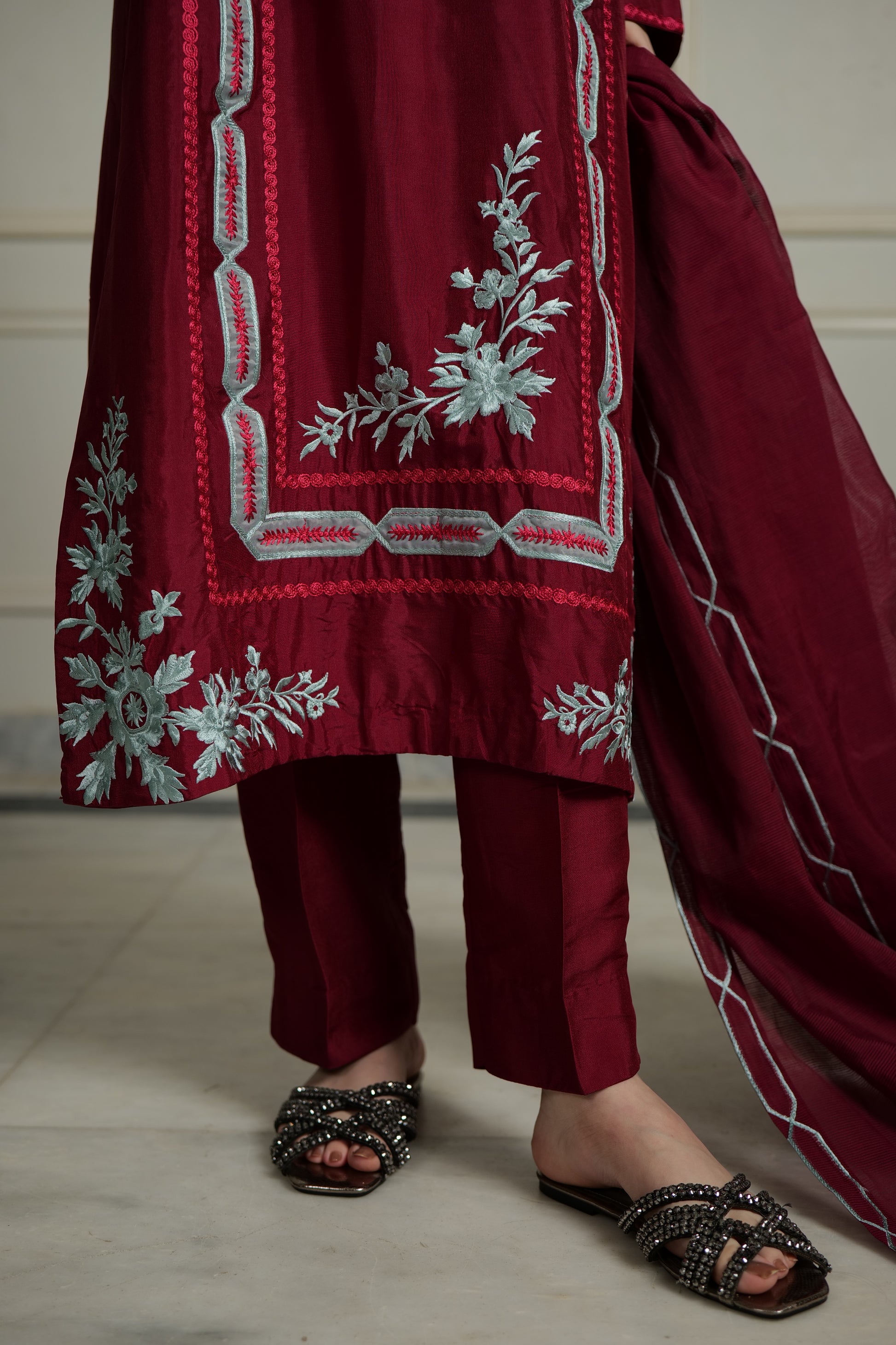 Product Detailing: A rich maroon three-piece adorned with intricate silver-blue embroidery, Elara embodies regal elegance. The