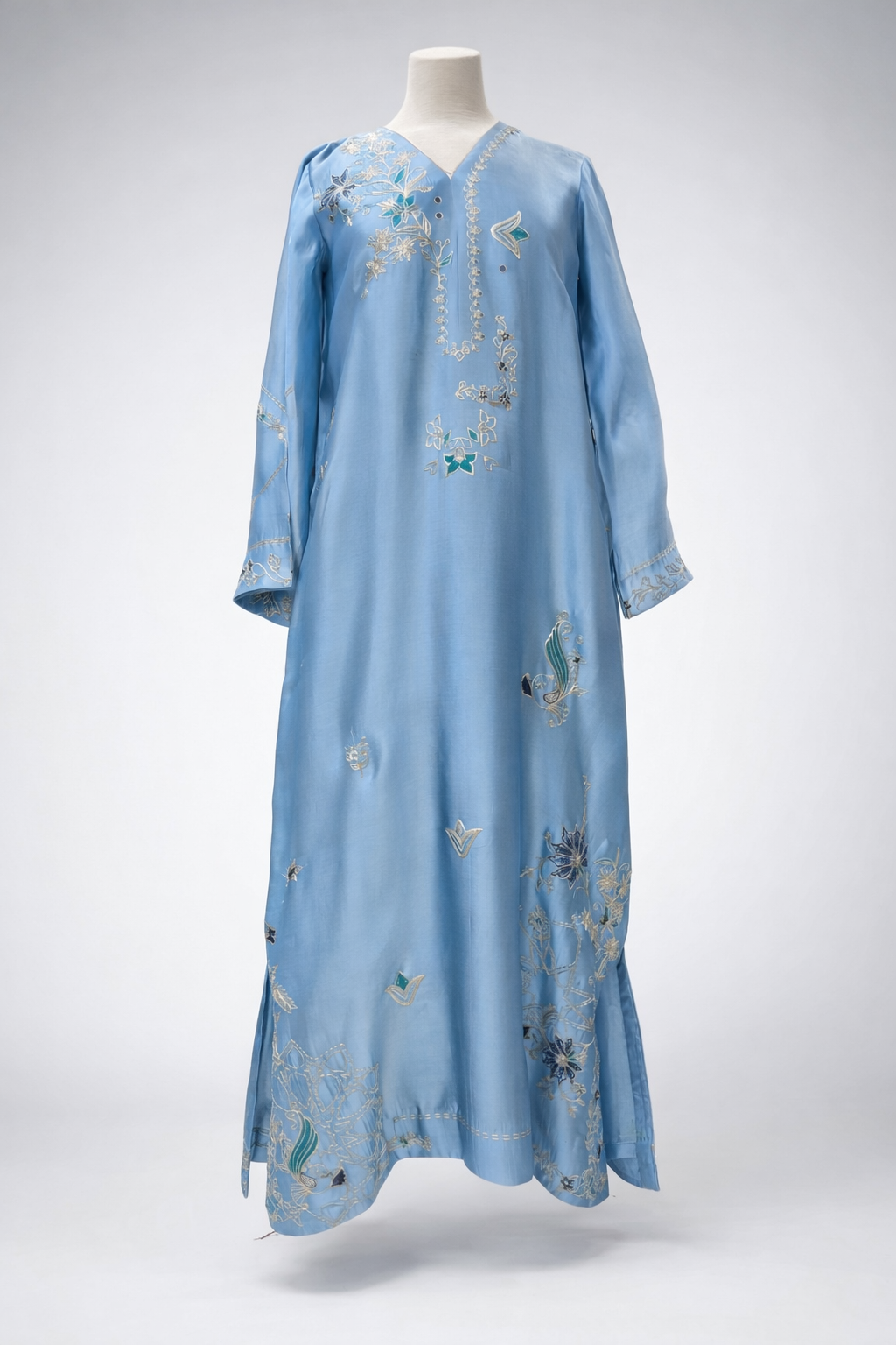 The Mahveen kaftan features intricate silk thread embroidery on sheesha silk fabric, providing a luxurious texture and aesthetic appeal. This combination enhances breathability and comfort, making it suitable for various occasions. The craftsmanship ensures durability, with the silk maintaining its vibrancy through repeated use and care.