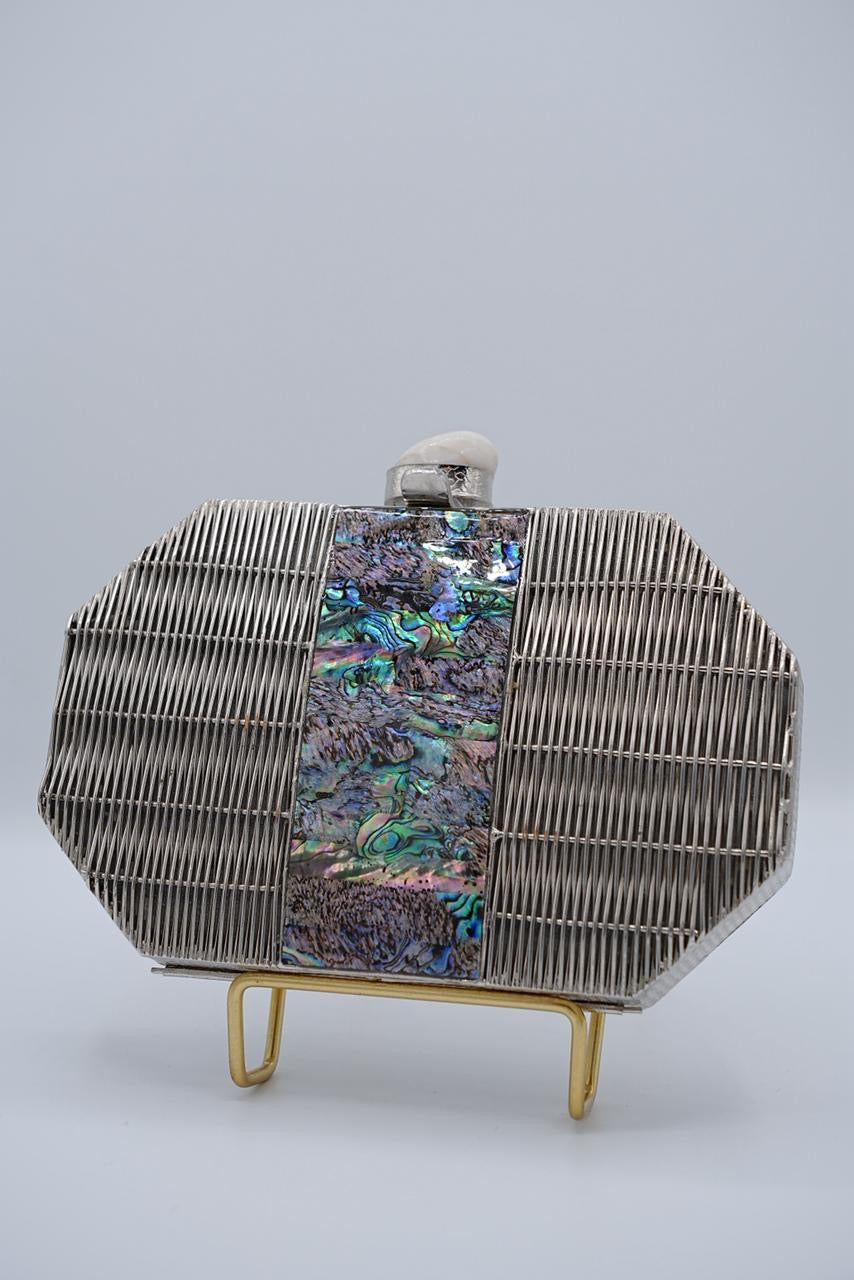 Presenting the Silver Mosaic Luxe Clutch — a refined fusion of iridescent mother-of-pearl and sculpted silver-polished brass.