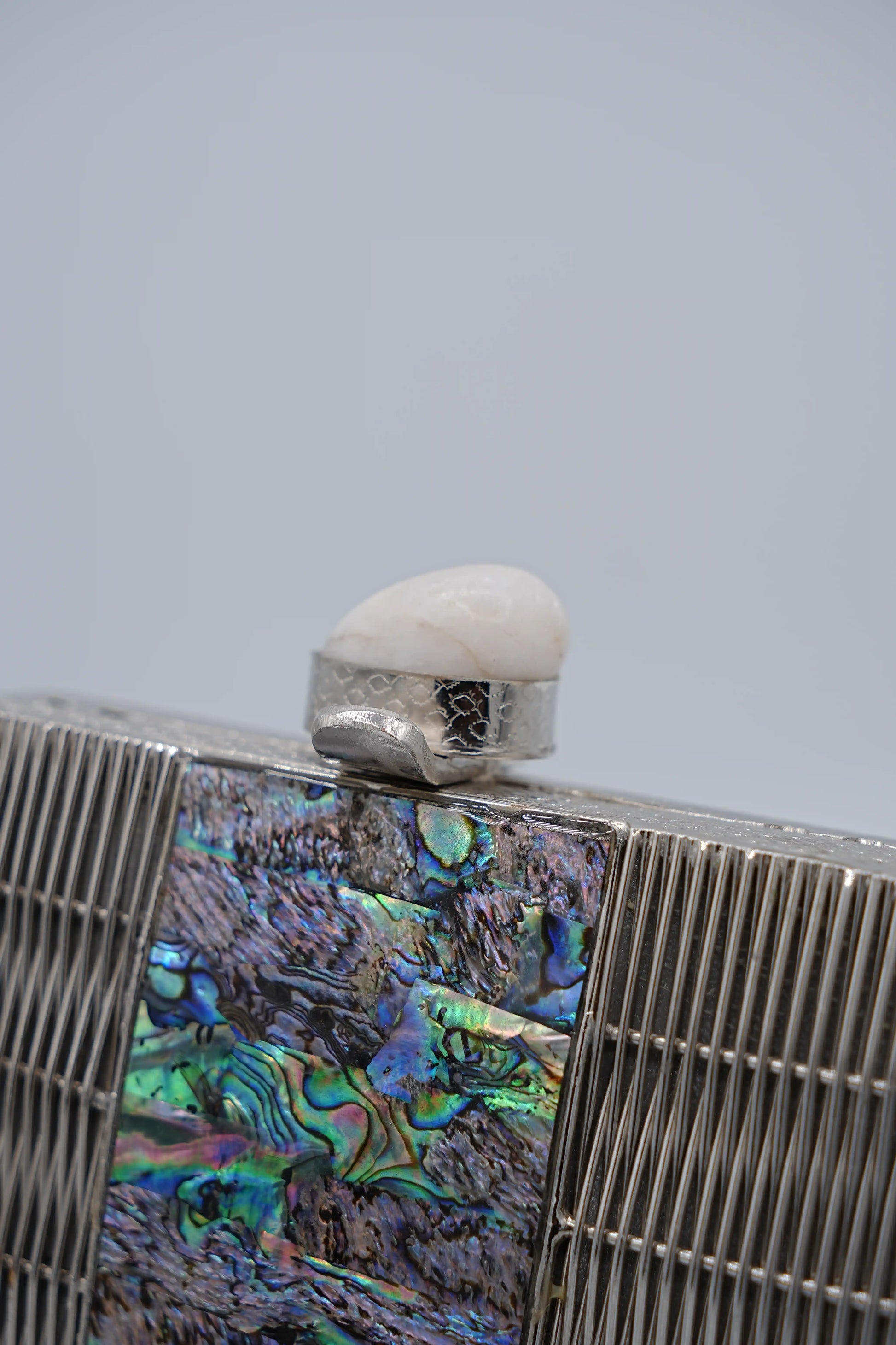 This distinctive piece features a shimmering mother-of-pearl base with natural pastel undertones, creating a soft, elegant luminosity. The front is adorned with an intricately crafted silver-polished brass panel, showcasing geometric metalwork that adds depth, character, and a high-fashion architectural appeal.