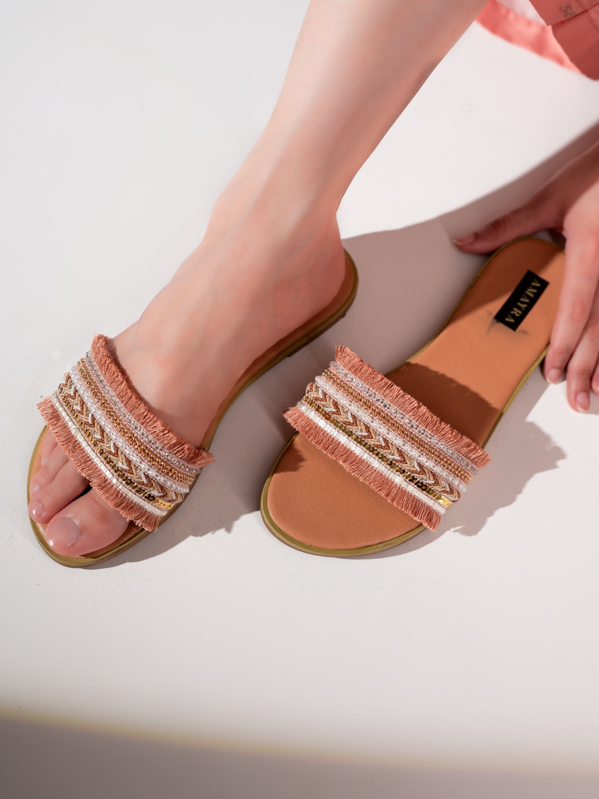 Peach Vibes are the ultimate fashion statement for any occasion. The delicately threaded design adds a touch of elegance and charm, while the minimal style enhances any outfit. Adding these flats to your wardrobe gives you the versatility to elevate a casual look or complete a stylish dinner outfit.