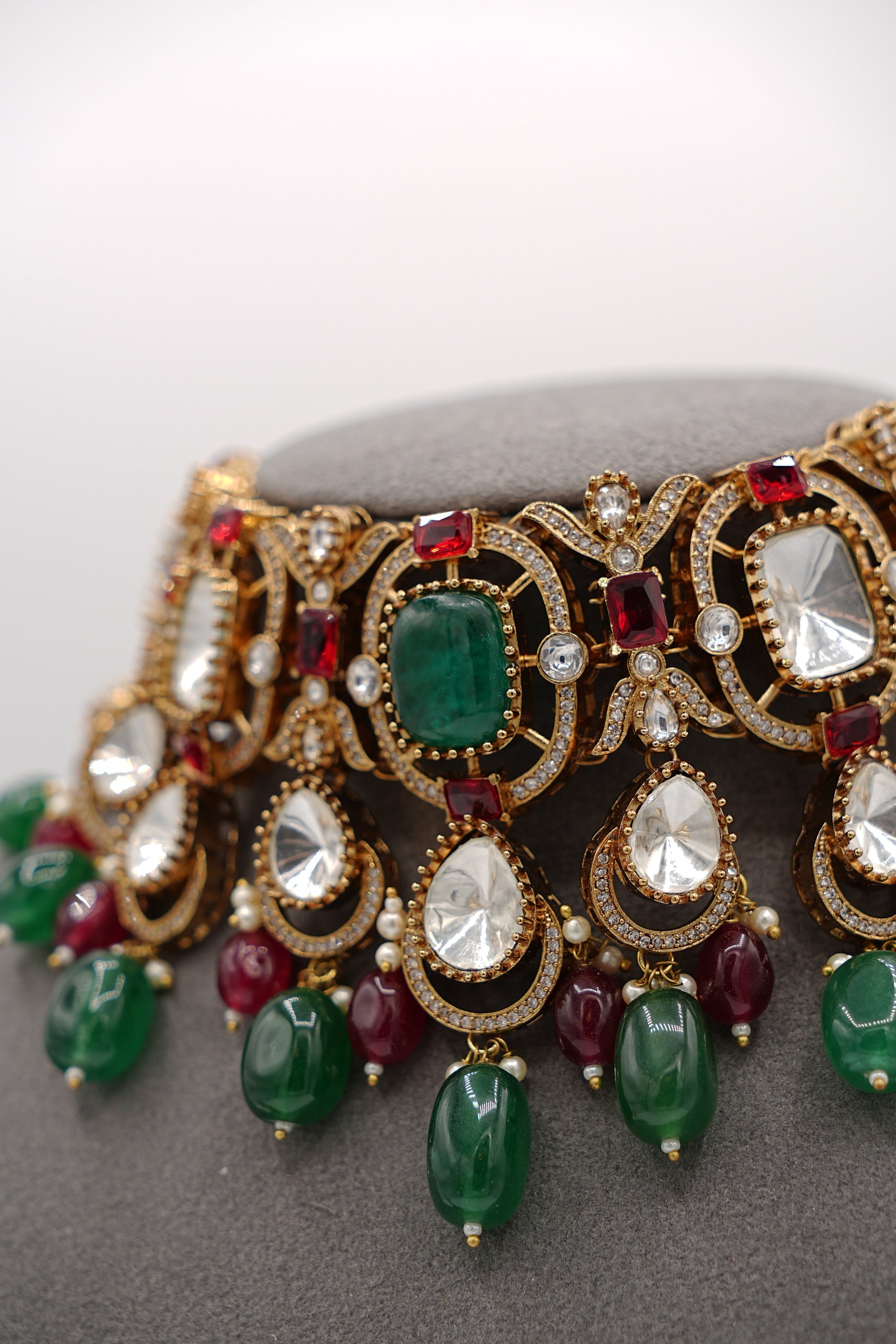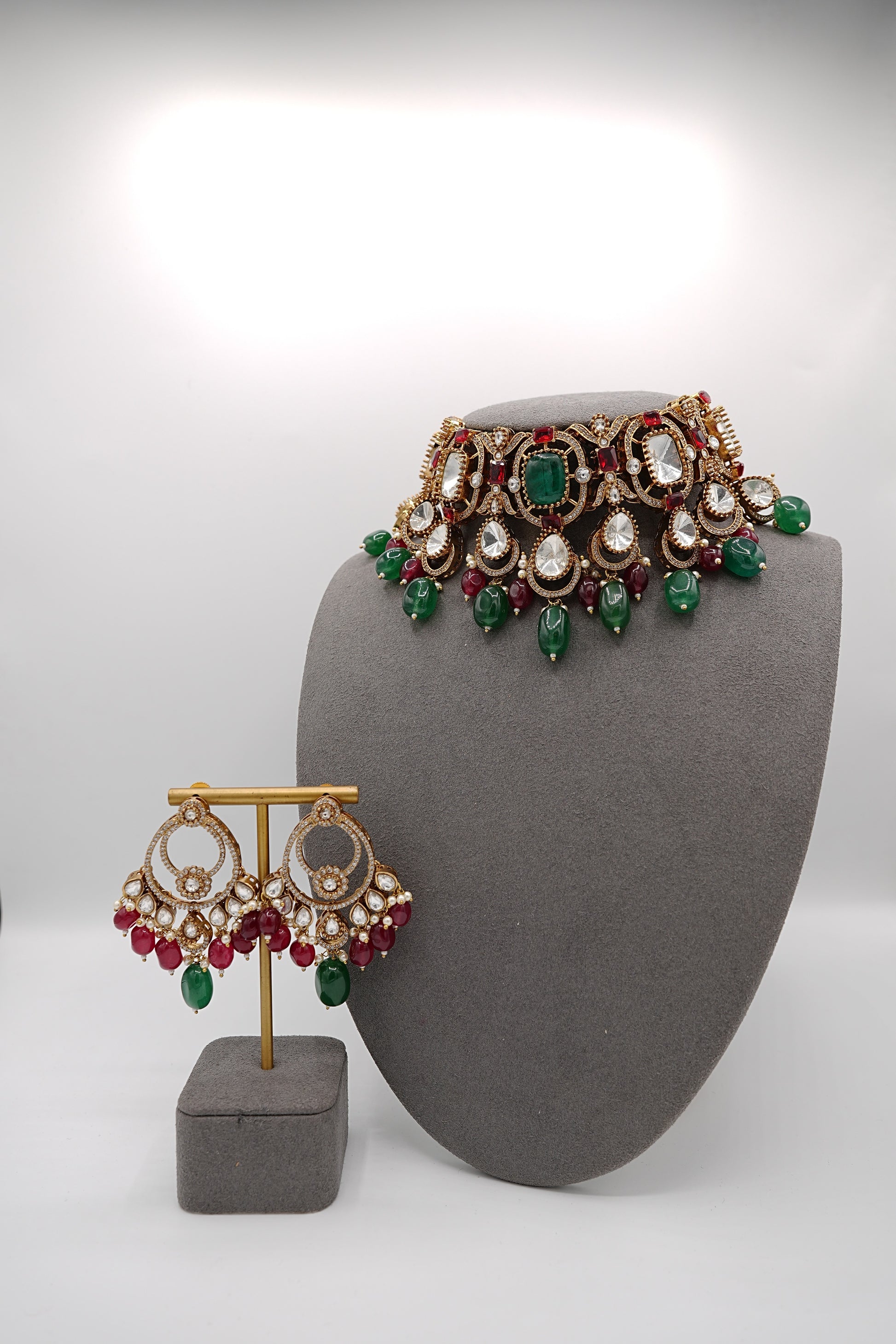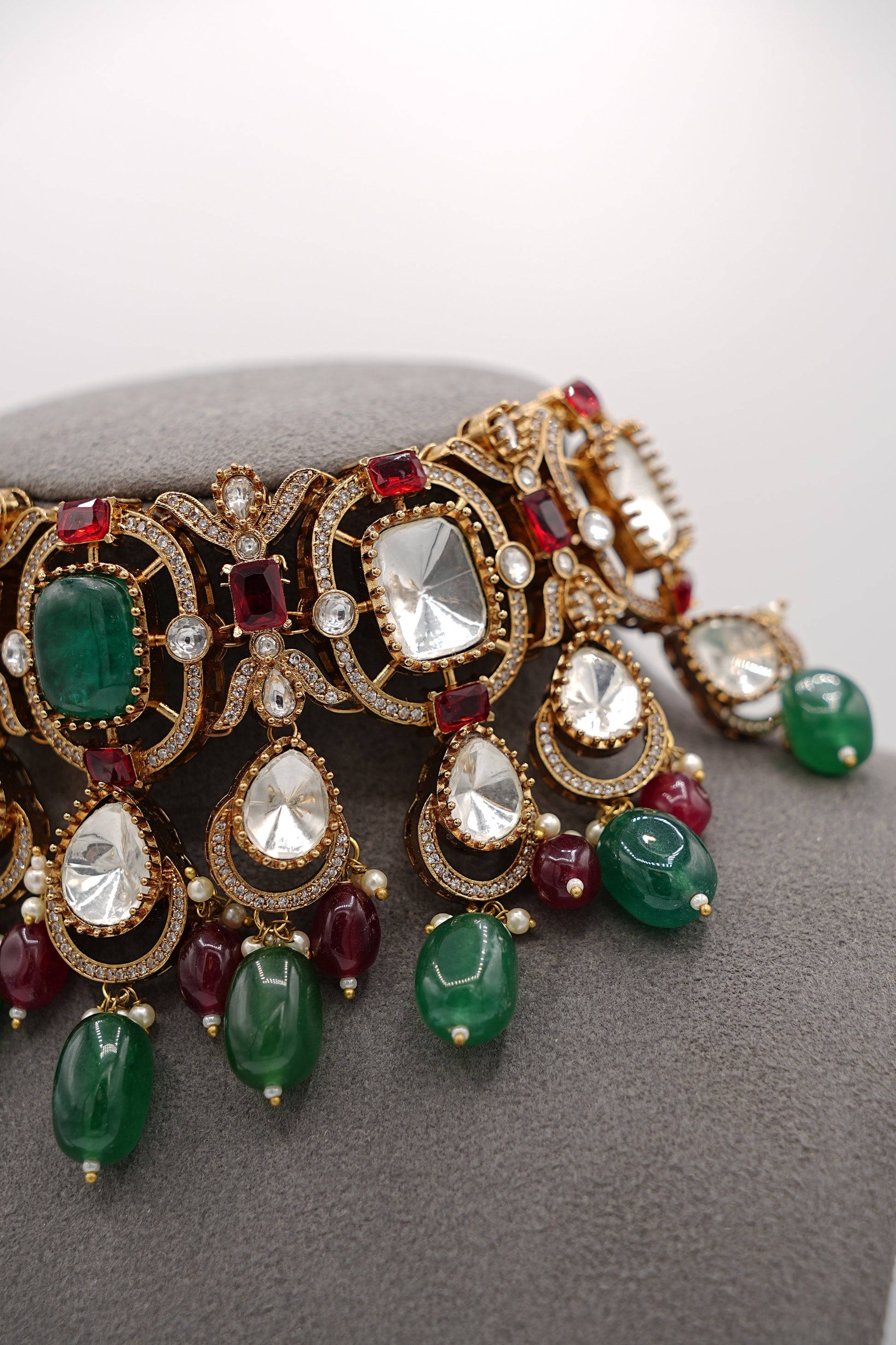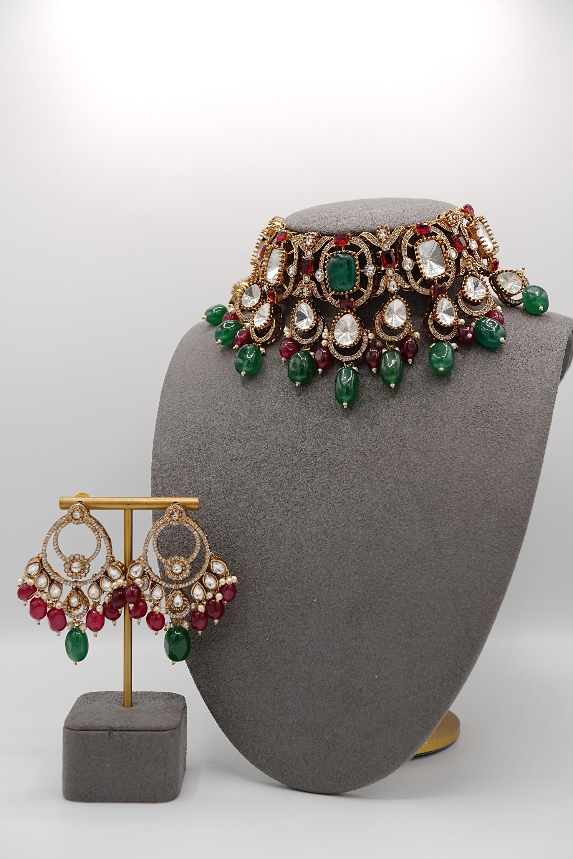 This Royal Heirloom necklace set boasts stunning emeralds and rubies, adding a touch of royalty to any outfit. The precision in crafting this set is evident in the vibrant colors and delicate detailing. Perfect for any formal event or as a luxurious gift for a loved one.