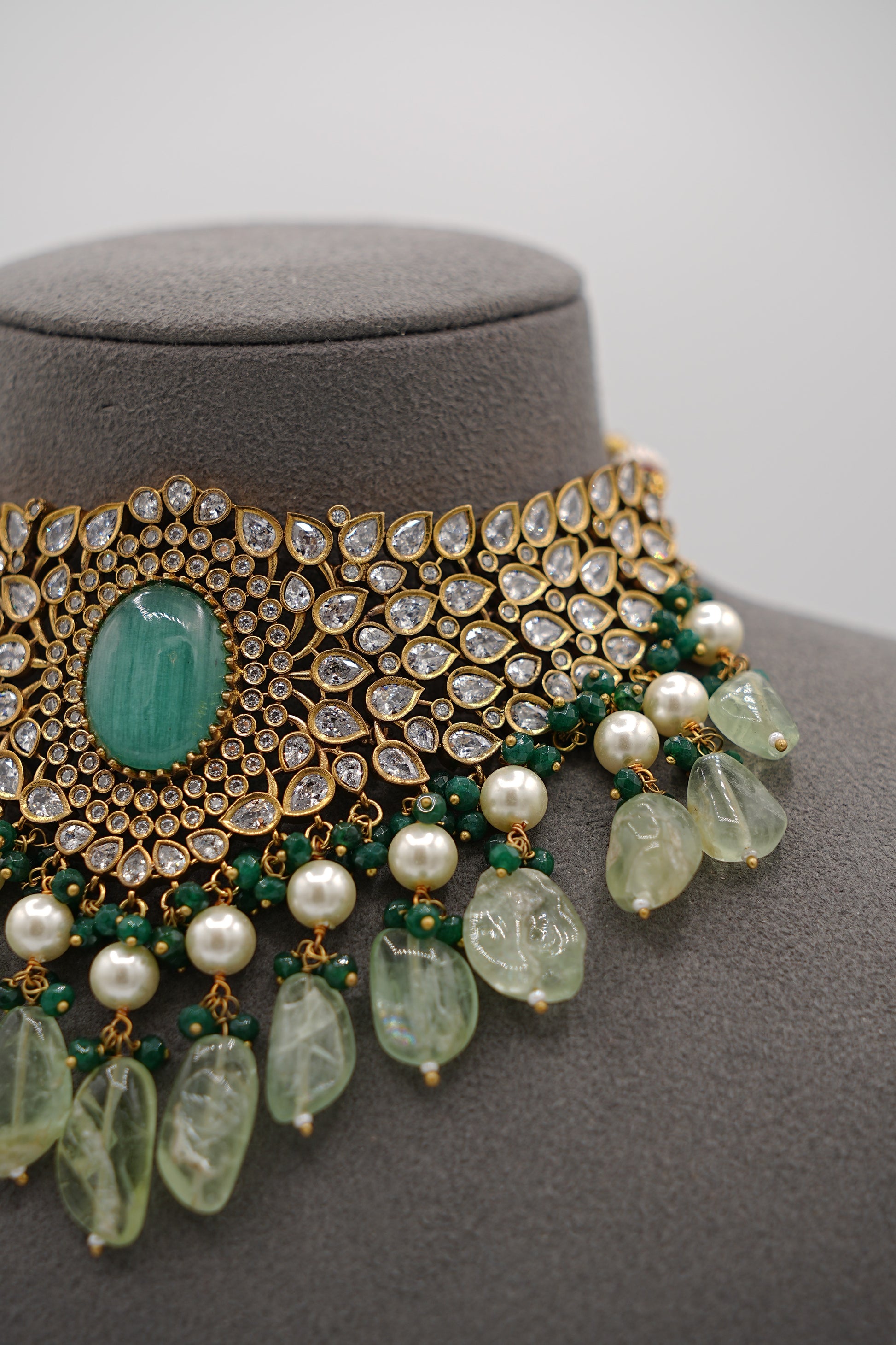 Expertly crafted with a silver base and 24k gold plating, our Polki Feroza Necklace Set exudes luxury and elegance. Adorned with moissanite polki, this stunning necklace set will add a touch of sparkle to any occasion. Turn heads and make a statement with this exquisite piece.