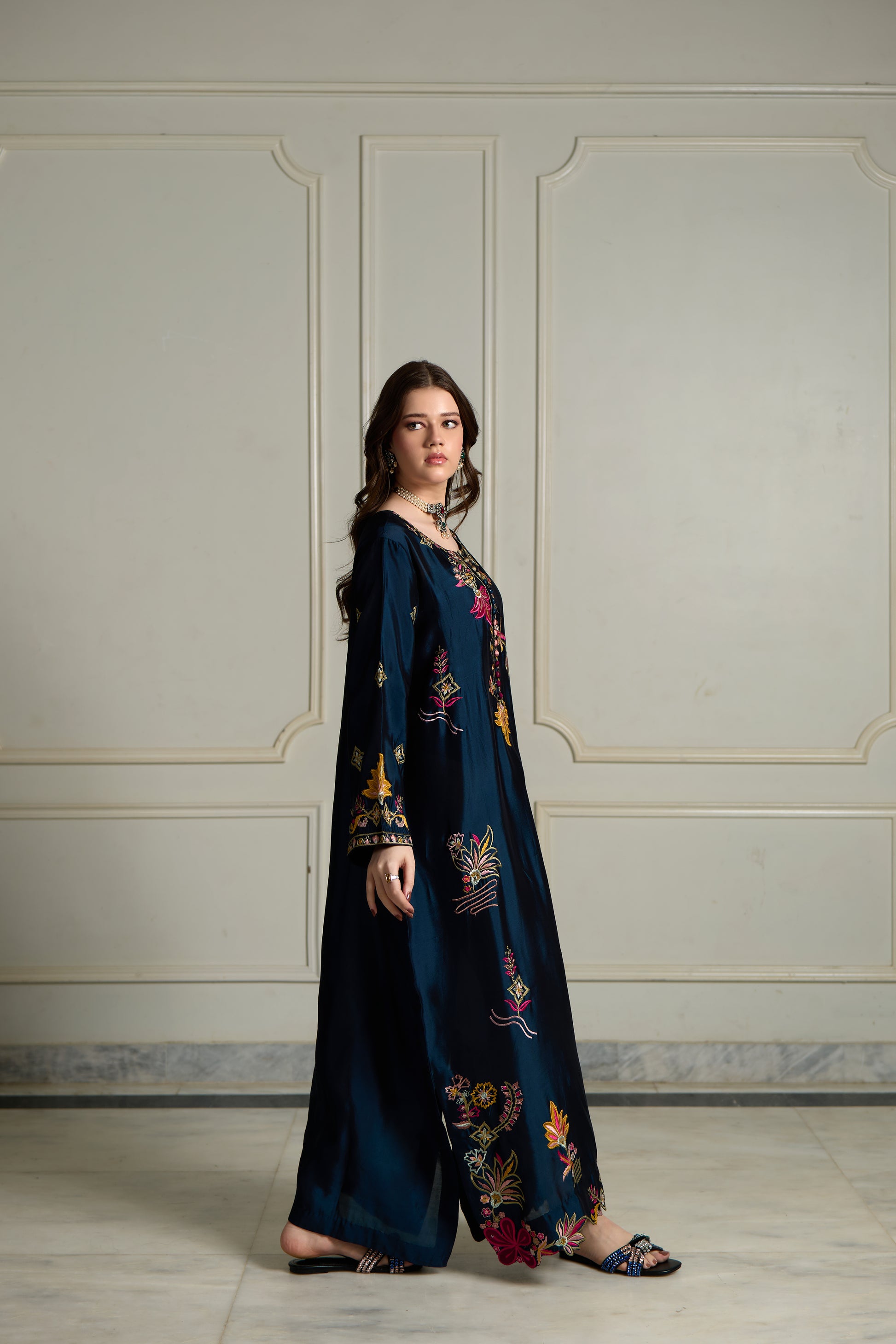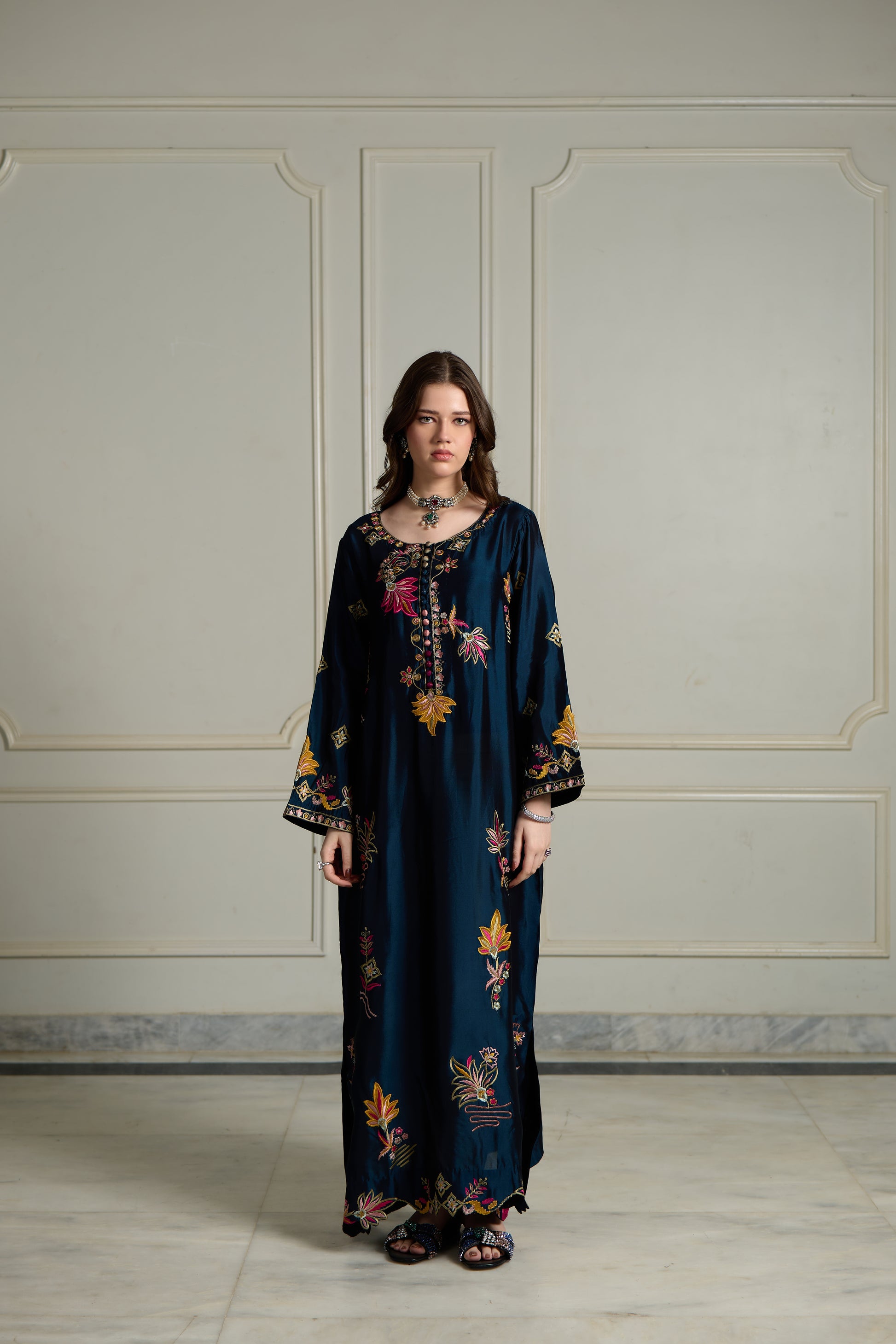 Product Detailing: A deep jewel-toned kaftan adorned with delicate, hand-finished floral embroidery. The fluid silhouette drapes